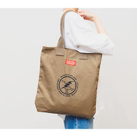 カーキのボディにピンクのロゴが映えるトートバッグ。持ち運びしやすいサイズ感で日常使いにピッタリ。