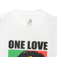 フロントに「ONE LOVE」ロゴをフィーチャーしたボブ・マーリーのラスタ・カラー・グラフィックを、バックにはアルバム『エクソダス』収録の名曲「3羽の小鳥」のメッセージをプリントした公式Tシャツ。