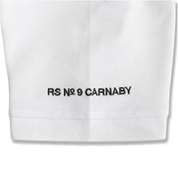 24年春夏コレクション。白いポロシャツは、前面にバブルレターのタンロゴ刺繍が施され、袖にも「RS No. 9 Carnaby」の刺繍が入っています。