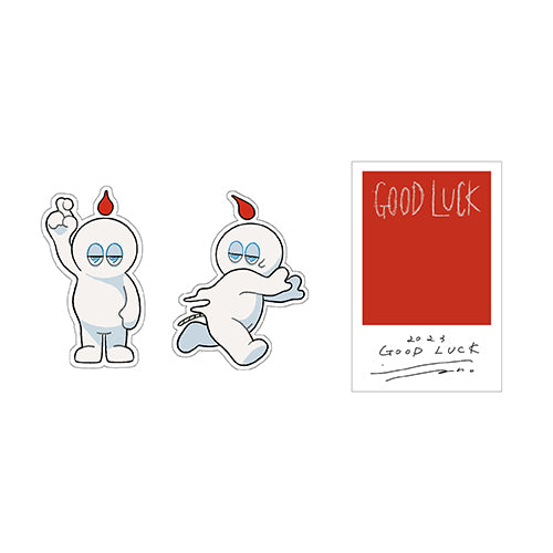 Sano ibuki公式キャラクター、赤い炎のお兄ちゃん「キャンメラ」と青い炎の弟「チョロウ」から成る”キャンドルブラザーズ”それぞれのキャラクターを紐解くステッカーセット。キャンメラver.はGOOD LUCKのハンドサインを掲げたポーズと、逃げ惑うポーズ。それぞれのテーマカラーを用いた台紙ステッカーはSanoのサイン入り!